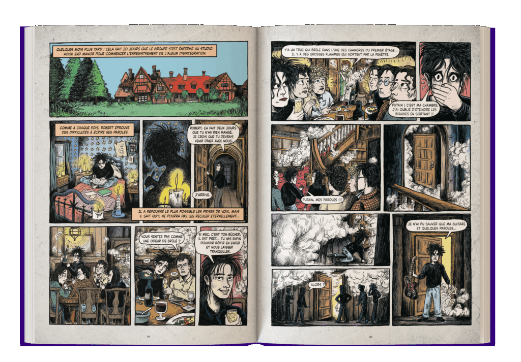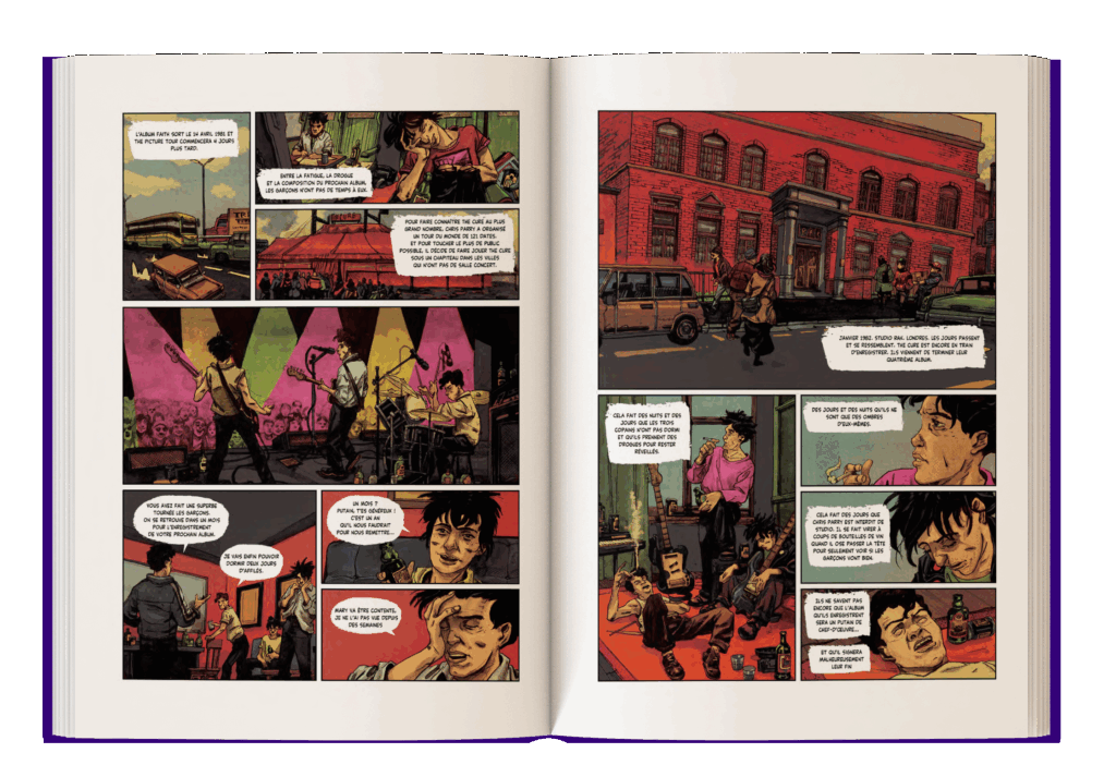 Les auteurs ont réussi, la plupart du temps, à maintenir une cohérence dans la représentation de Robert Smith et des différents membres, tout en exploitant les ambiances spécifiques à chaque ère musicale. Les vignettes qui ont suscité le plus d'intérêt chez moi - et également le plus de questionnements quant à la méthode, j'y reviendrai plus tard - sont celles qui illustrent les moments d'intimité (processus créatif, tensions internes, questionnements de Robert Smith, etc.) qui, bien qu'ils soient connus, n'ont pas d'autres témoins que les personnes directement impliquées.