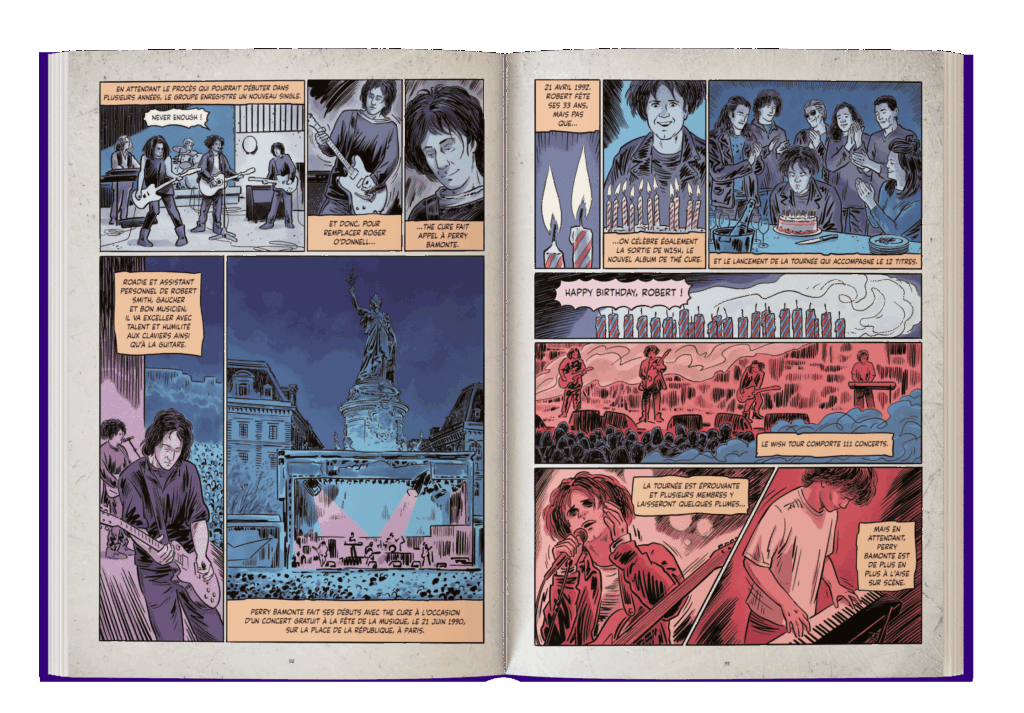 Et c'est également pour cette raison que l'auteur se prend à imaginer le déroulé de telle ou telle situation. Je vous le disais plus haut dans cette chronique, certains moments intimes de la vie du groupe ou vécus par Robert Smith sont dépeints dans les pages de ce docu-BD. Prenons cette scène où Robert Smith est sur la plage de Bognor Regis (selon toute logique) uniquement accompagné de Mary et marquant le coup à l'annonce du départ de Boris Williams et Porl Thompson après le Wish Tour. Ou cette case montrant Robert Smith dormant en enlaçant sa guitare Top 20 - qu'il adorait il est vrai - contre lui. Comment être sûr que ces événements se sont passés ainsi ? La réponse est : peu importe. Car si au début cela m'a dérangé, j’ai compris que la partie bande dessinée de ce docu-BD est romancé, avec ce que cela comporte comme liberté et imagination pour l'auteur. Les textes illustrés inter-chapitres ont ainsi une vocation complémentaire, davantage encyclopédique.