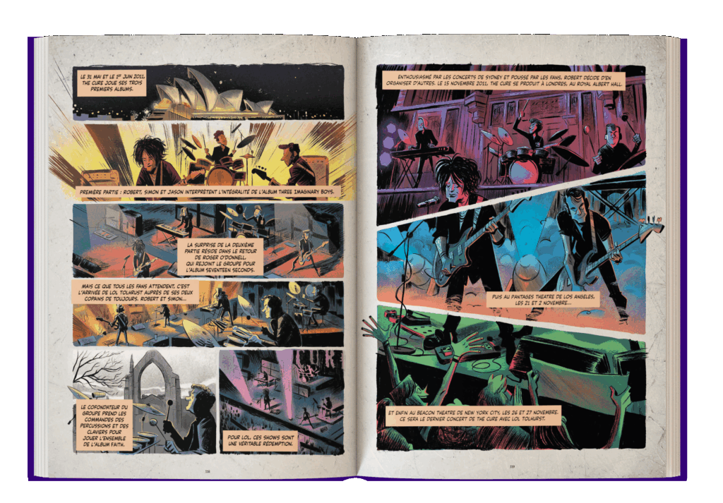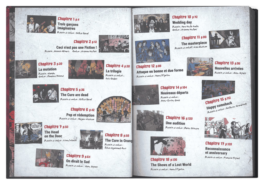 Pour ce qui est du récit, le livre retrace l'histoire du groupe chronologiquement, depuis Easy Cure jusqu'à la sortie de Songs Of A Lost World. Soit grosso modo la période 1976-2024. Le traitement de chaque période obéit toujours à la même logique : 6 pages de bande dessinée suivies de 2 pages de textes illustrés.
